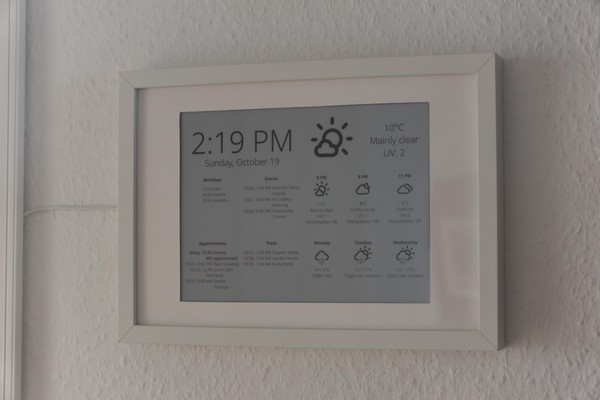 I created another infodisplay which does not only display the weather and upcoming birthdays (now via CardDAV), but also appointments & trash dates from your calendar (using CalDAV) as well as events in your city.