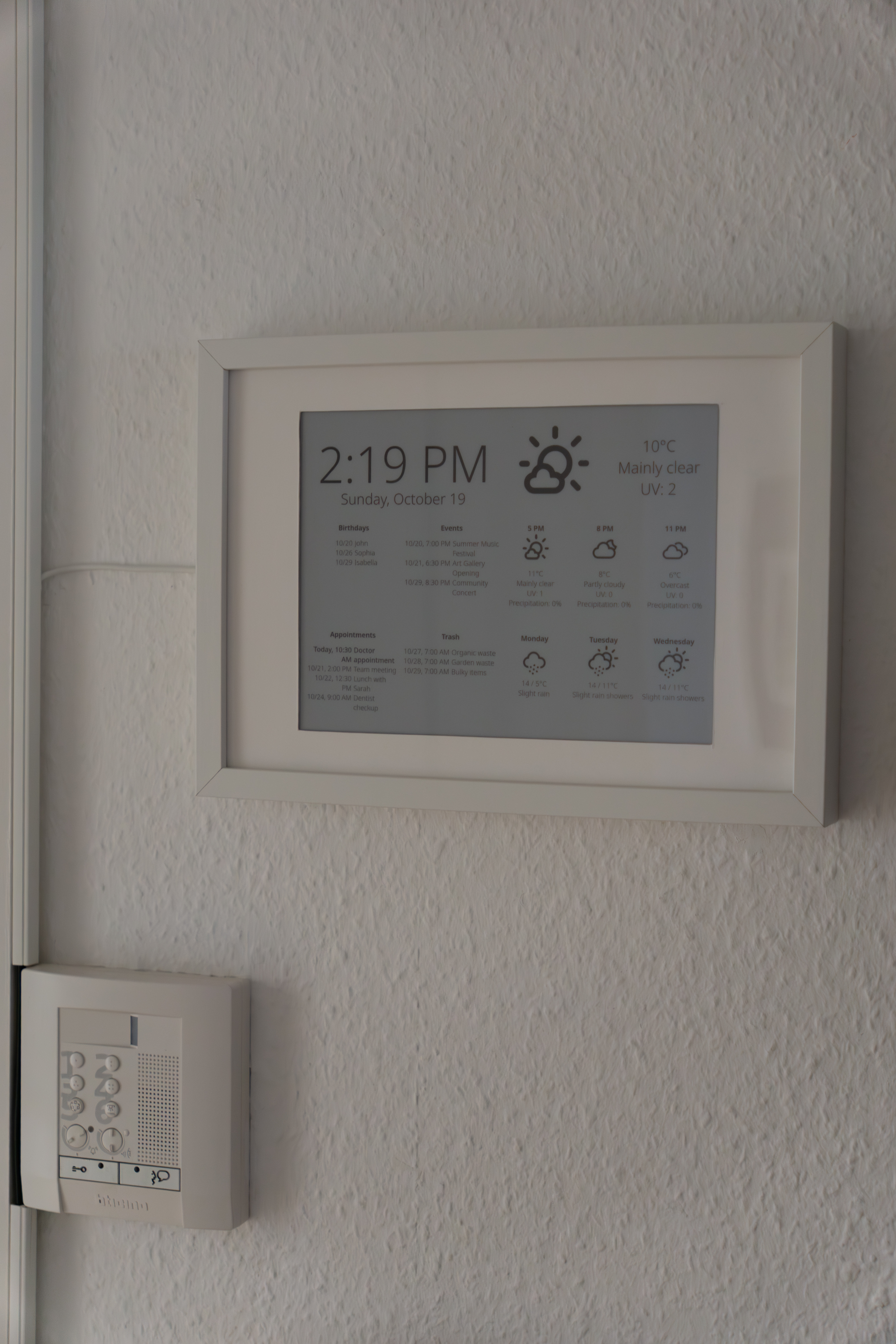 I created another infodisplay which does not only display the weather and upcoming birthdays (now via CardDAV), but also appointments & trash dates from your calendar (using CalDAV) as well as events in your city.