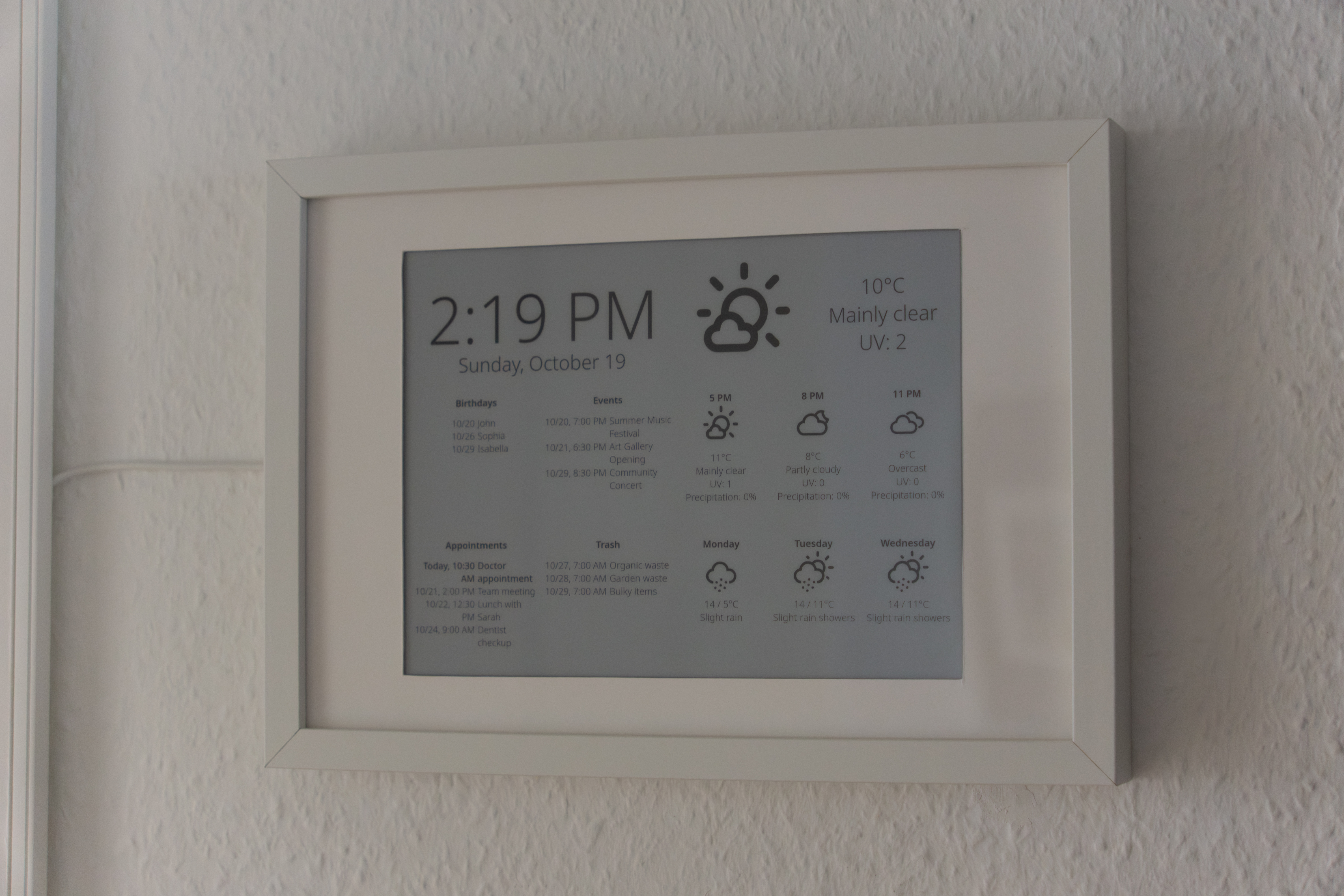 At first, I defaulted to use Go for the server, as it has become my go-to language for backends. But the only package that implements a CalDAV (needed to fetch calendar entries) and CardDAV (for Birthdays) seemed to be go-webdav, which unfortunately (still, at the time of writing this) has an issue with Apple’s icCloud/iCal, preventing any of my girlfriend’s appointments or her contact’s birthdays to show up on the infodisplay.
